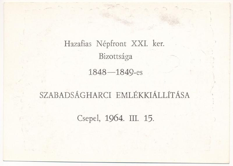 1849. 10Ft ‘Kincstári utalvány’ imitációja, hátoldalán ‘Hazafias Népfront XXI. ker. Bizottsága 1848-1849-es Szabadságharci Emlékkiállítása Csepel 1964. III. 15.’ (2xklf) T:AU egyiken kisebb beszakadások