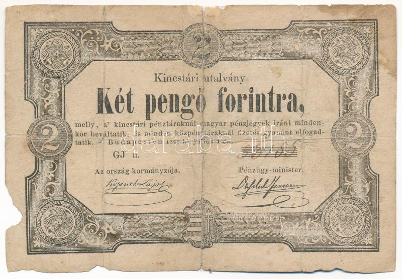 1849. 2Ft ‘Kincstári utalvány’ ‘GJ u. 56155’ T:IV ragasztva, anyaghiány, folt Adamo G108<a href="https://www.darabanth.com/hu/gyorsarveres/435/kategoriak~Numizmatika/Magyar-bankjegyek~1000007/1849-2Ft-Kincstari-utalvany-GJ-u-56155-TIV-ragasztva-anya