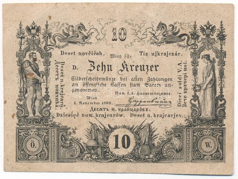 1860. 10kr ‘D’ sorozat T:III tűzőgép lyuk, folt Hungary 1860. 10 Kreuzer ‘D’ series C:F stapler holes, spot Adamo G92<a href="https://www.darabanth.com/hu/gyorsarveres/423/kategoriak~Numizmatika/Magyar-bankjegyek~6000007/1860-10kr-D-sorozat-TIII-tuz