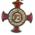 1869-1914. ‘Arany Érdemkereszt’ aranyozott, zománcozott bronz kitüntetés ‘MAYERS SÖH – IN WIEN’ gyártó jelzéssel és csillag beütéssel, eredeti szalagon, kardokkal T:2 zománchibák Hungary 1869-1914. ‘Golden Merit Cross’ gilt, enamelled bronze decoration wi