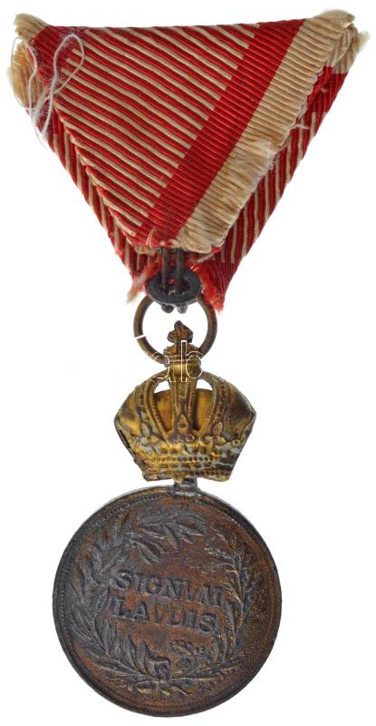 1890. ‘Bronz Katonai Érdemérem a katonai érdemkereszt szalagján’ aranyozott hadifém kitüntetés, eredeti viseltes mellszalaggal T:2 kopott aranyozás Hungary 1890. ‘Bronze Military Merit Medal on a war ribbon (Signum Laudis)’ gold plated war metal decoratio