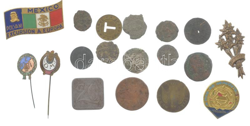 18db-os vegyes jelvény, érme, és szükségpénz tétel, közte több gyenge tartású római bronz és egy denár T:vegyes