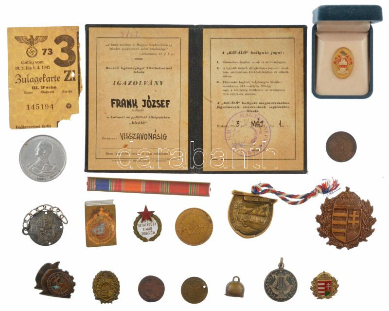 18db-os vegyes tétel, közte jelvényekkel (egyik sérült) T:vegyes<a href="https://www.darabanth.com/hu/gyorsarveres/431/kategoriak~Numizmatika/Vegyes-papir-es-fempenz-tetelek~1500022/18db-os-vegyes-tetel-kozte-jelvenyekkel-egyik-serult-Tvegyes~II2766