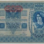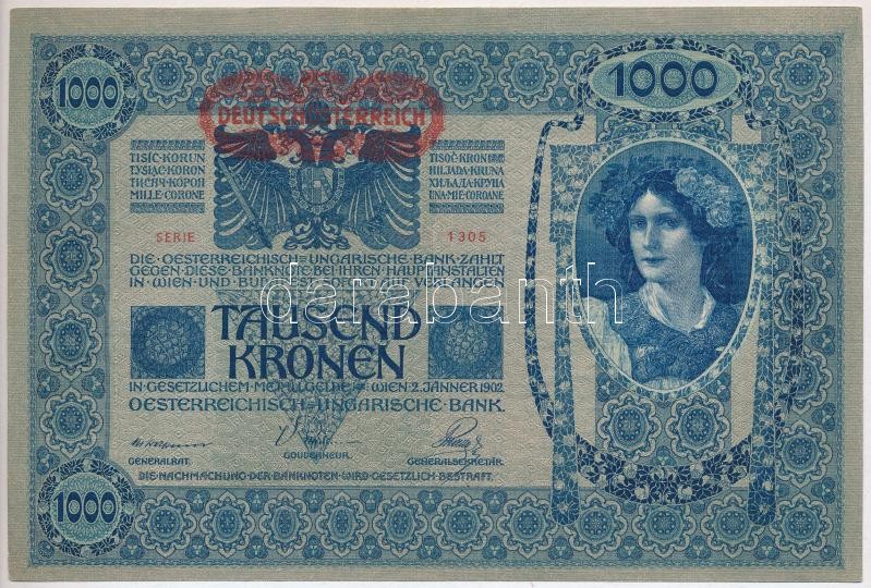 1902. 1000K függőleges, piros ‘DEUTSCHÖSTERREICH’ felülbélyegzéssel T:I- Adamo K35B<a href="https://www.darabanth.com/hu/gyorsarveres/423/kategoriak~Numizmatika/Magyar-bankjegyek~6000007/1902-1000K-fuggoleges-piros-DEUTSCHOSTERREICH-felulbelyegzesse
