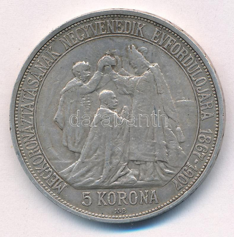 1907KB 5K Ag ‘Ferenc József megkoronázásának 40. évfordulója’ T:VF patina, ph. Adamo K7.1<a href="https://www.darabanth.com/hu/gyorsarveres/438/kategoriak~Numizmatika/Magyar-es-magyar-verdejelu-fem-es-ezustpenzek~1500008/1907KB-5K-Ag-Ferenc-Jozsef-m