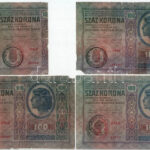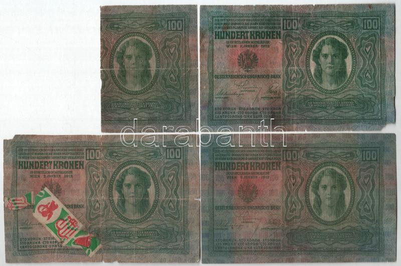 1912. 100K fekete ‘ROMANIA TIMBRU SPECIAL’ felülbélyegzéssel (4db, egyiknek a fele hiányzik) T:III-V<a href="https://www.darabanth.com/hu/gyorsarveres/435/kategoriak~Numizmatika/Magyar-bankjegyek~1000007/1912-100K-fekete-ROMANIA-TIMBRU-SPECIAL-felul