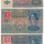 1913. 20K ‘1737 039021’ csehszlovák 20h bélyeggel felülbélyegezve + 1913. 20K ‘1016 579737’ csehszlovák 20h bélyeggel felülbélyegezve + 1915. 10K ‘1137 184906’ csehszlovák 10h bélyeggel felülbélyegezve T:III,III-