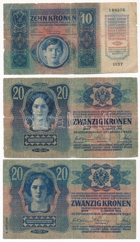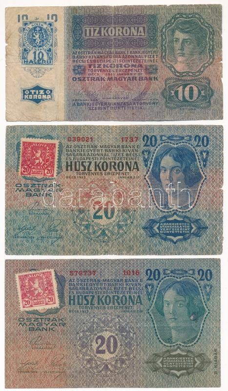 1913. 20K ‘1737 039021’ csehszlovák 20h bélyeggel felülbélyegezve + 1913. 20K ‘1016 579737’ csehszlovák 20h bélyeggel felülbélyegezve + 1915. 10K ‘1137 184906’ csehszlovák 10h bélyeggel felülbélyegezve T:III,III-<a href="https://www.darabanth.com/hu