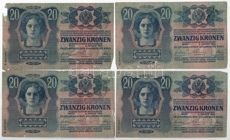 1913. 20K ‘II. kiadás’ fekete ‘ROMANIA TIMBRU SPECIAL’ felülbélyegzéssel (4db) T:F,VG kisebb anyaghiány Adamo K17<a href="https://www.darabanth.com/hu/gyorsarveres/440/kategoriak~Numizmatika/Magyar-bankjegyek~1500007/1913-20K-II-kiadas-fekete-ROMANI