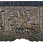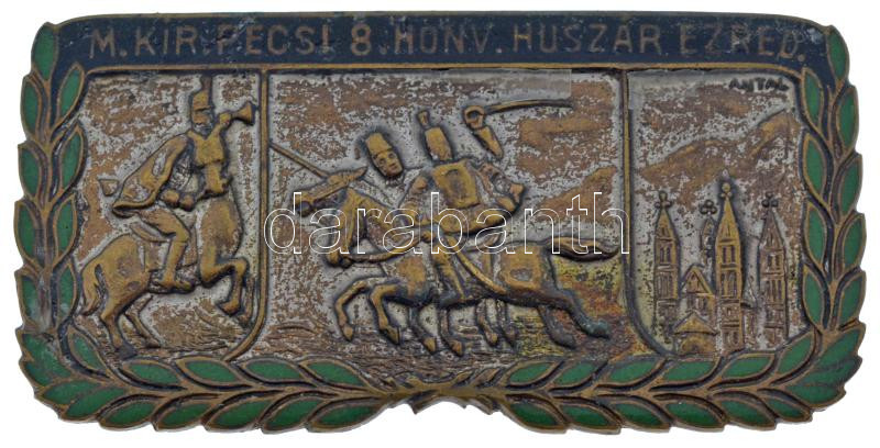 ~1914. ‘M. Kir. 8. Pécsi Honv. Huszár Ezred (Magyar Királyi Pécsi 8. Honvéd Huszárezred)’ részben zománcozott és ezüstözött bronz jelvény. Szign.: Antal (62x31mm) T:XF,VF zománchiba, kopott ezüstözés / Hungary ~1914. ‘M. Kir. 8. Pécsi Honv. Huszár Ezred (