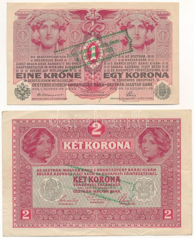 1916. 1K + 1917. 2K, mindkettő hamis felülbélyegzéssel (fake overprint) T:III Adamo K3, K6<a href="https://www.darabanth.com/hu/gyorsarveres/413/kategoriak~Numizmatika/Magyar-bankjegyek~1500007/1916-1K-plus-1917-2K-mindketto-hamis-felulbelyegzessel-