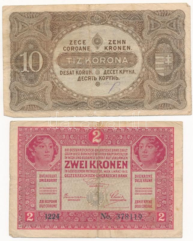 1917. 2K + 1920. 10K + Német Birodalom 1910. 1000M zöld pecsét, hétjegyű sorszámmal + 1000M vörös pecsét, hétjegyű sorszámmal T:III folt Hungary 1917. 2 Korona + 1920. 10 Korona + German Empire 1910. 1000 Mark with green seal, 7 digit serial + 1000 Mark w