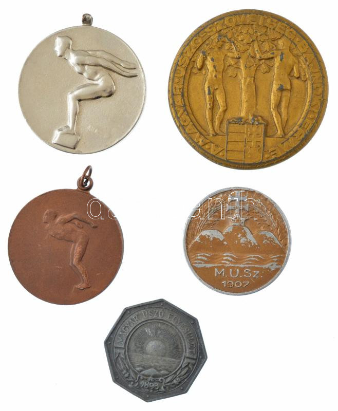 ~1920-1960. Úszó díjérmek (5xklf) közte Göröntsér Greff Lajos (1888-1976) 1920. ‘A Magyar Úszószövetség Bajnoki Érme’ egyoldalas aranyozott Zn díjérem, (50mm) 1943. ‘Magyar Úszó Egyesület / 50 év a sport szolgálatában’ nyolcszögletű Zn emlékérem (30mm) T: