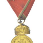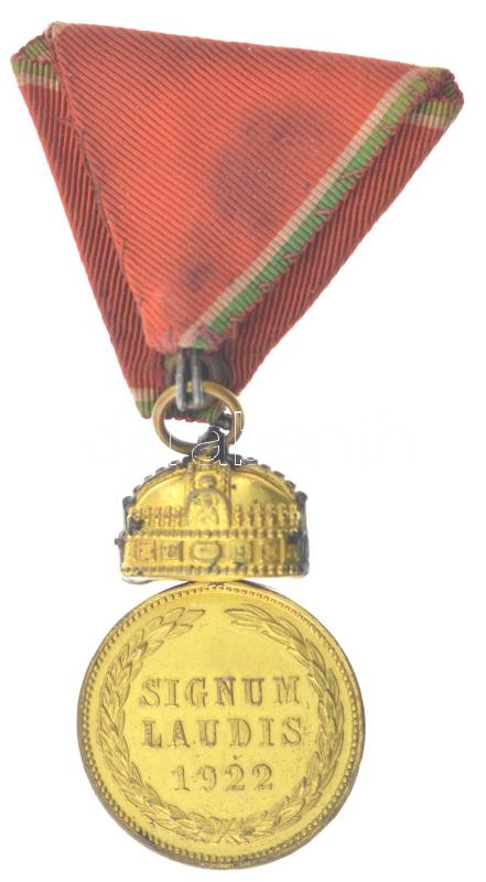 1922. ‘Magyar Koronás Bronzérem hadiszalagon, kardokkal’ aranyozott bronz kitüntetés mellszalagon, peremén ‘BRONZ’ jelzéssel, mellszalagon T:2 kopott aranyozás Hungary 1922. ‘Hungarian Bronze Medal with the Holy Crown with swords on war