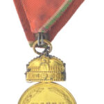 1922. ‘Magyar Koronás Bronzérem hadiszalagon, kardokkal’ aranyozott bronz kitüntetés mellszalagon, peremén ‘BRONZ’ jelzéssel, mellszalagon T:2 kopott aranyozás Hungary 1922. ‘Hungarian Bronze Medal with the Holy Crown with swords on war ribbon’ gold plate