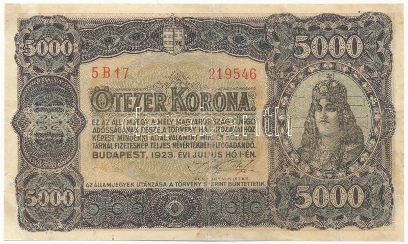 1923. 5000K nyomdahely jelölés nélkül, ‘5B17 219546’ T:III restaurált / Hungary 1923. 5000 Korona ‘5B17 219546’ C:F restored Adamo K39<a href="https://www.darabanth.com/hu/nagyaukcio/38/kategoriak~Numizmatika/Magyar-es-kulfoldi-bankjegyek~15627/1923