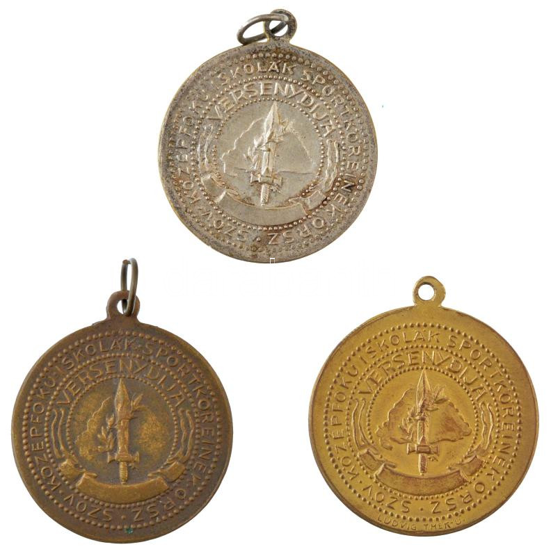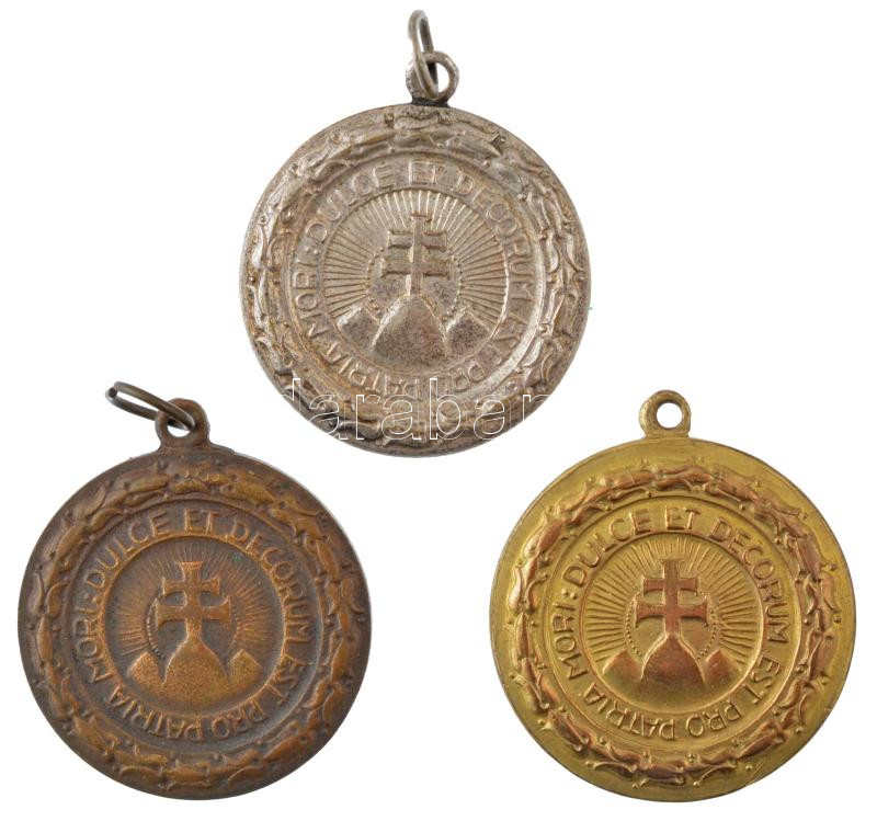 ~1930. ‘Középfokú Iskolák Sportköreinek Országos Szövetsége versenydíja / Dulce et decorum est pro patria mori’ irredenta díjérem arany, ezüst, bronz fokozat, egyik ‘LUDVIG THÉK U’ gyártói jelzéssel T:2 patina