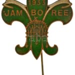 1933. „Jamboree” zöld-fehér zománcozott cserkész kitűző (37x32mm) T:XF kis zománchibák / Hungary 1933. „Jamboree” white-green enamelled Scouting badge with replaced pin (37x32mm) C:XF small enamel errors