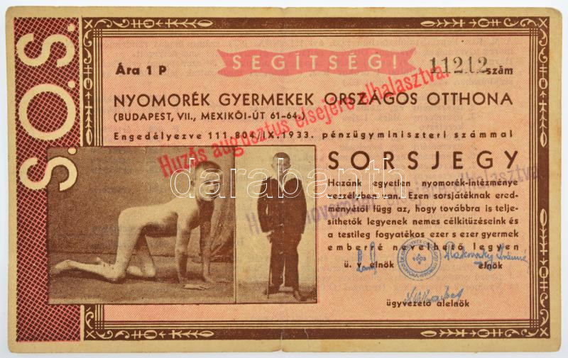 1933. ‘Nyomorék Gyermekek Országos Otthona’ sorsjegy 1P értékben, felülbélyegzésekkel, ‘11212’ sorszámmal T:III széleken kis szakadádok / Hungary 1933. ‘National Home for Crippled Children’ lottery ticket with the value of 1 Pengő, with