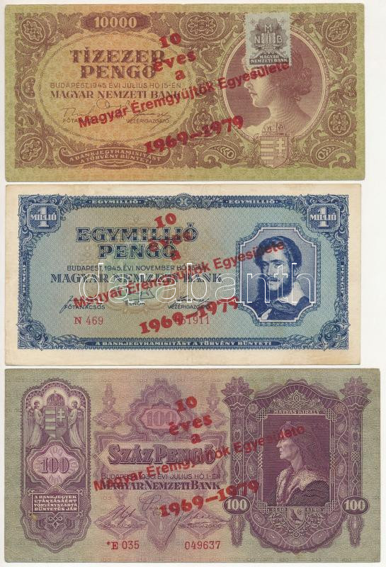 1936. 10P + 1941. 20P + 1930. 100P + 1945. 1000P + 1945. 10.000P + 1945. 1.000.000P mind ’10 éves a Magyar Éremgyűjtők Egyesülete 1969-1979′ felülbélyegzéssel T:III Adamo FF6.1.2, FF6.1.4, FF6.1.6, FF6.1.10, FF6.1.12, FF6.1.14<a href="https://www.da