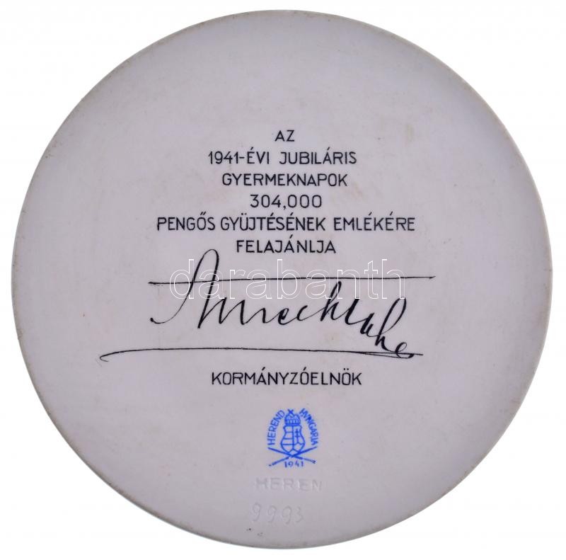 1941. ‘Országos Gyermekvédő Liga 1906-1941’ részben festett, aranyozott, jelzett Herendi porcelán plakett, ‘9993’-as sorszámmal ‘ORSZÁGOS GYERMEKVÉDŐ LIGA 1906-1941 / AZ 1941-ÉVI JUBILÁRIS GYERMEKNAPOK 304.000 PENGŐS GYŰJTÉSÉNEK