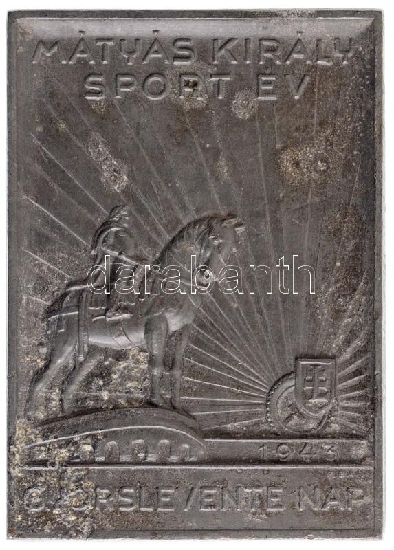 1943. ‘Mátyás Király Sport Év Gyorslevente Nap’ hadifém plakett, hátoldalon ‘LUDVIG’ gyártói jelzés (50x70mm) szign.: P.Bak T:2 oxidáció<a href="https://www.darabanth.com/hu/gyorsarveres/434/kategoriak~Numizmatika/Militaria~1500018/1943-Matyas-Kiral