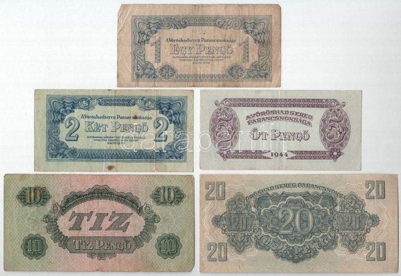 1944. 1P-50P (6xklf) + 100P (2x) ‘A Vörös Hadsereg Parancsnoksága’ T:III,III- fo.<a href="https://www.darabanth.com/hu/gyorsarveres/435/kategoriak~Numizmatika/Magyar-bankjegyek~1000007/1944-1P-50P-6xklf-plus-100P-2x-A-Voros-Hadsereg-Parancsnoksaga-T
