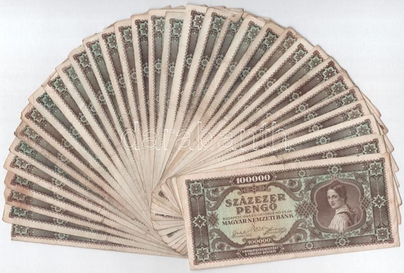 1945. 100.000P (34db) T:III,III- Adamo P24<a href="https://www.darabanth.com/hu/gyorsarveres/422/kategoriak~Numizmatika/Magyar-bankjegyek~2000006/1945-100000P-34db-TIII-III–Adamo-P24~II2678393/?utm_source=affiliate&utm_medium=mutargy&utm_campaign=a