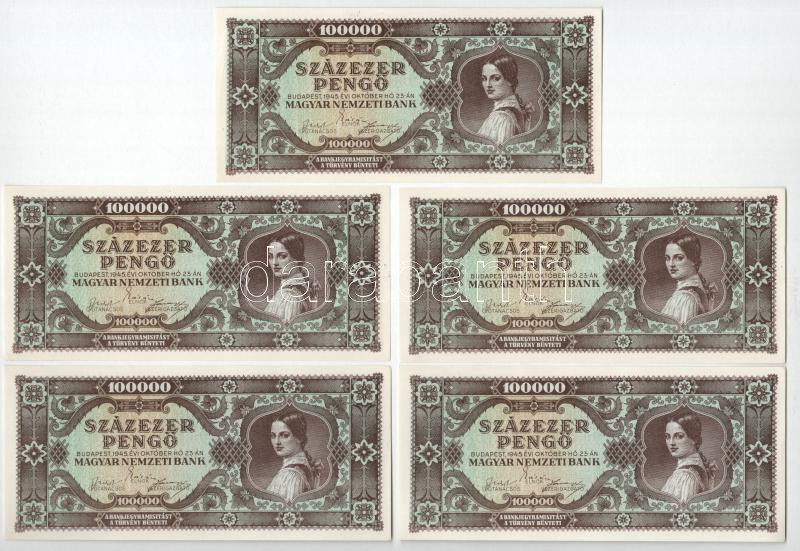 1945. 100.000P (5x) sorszámkövetők ‘M 108 015078 – M 108 015082’ T:AU / Hungary 1945. 100.000 Pengő (5x) consecutive serials ‘M 108 015078 – M 108 015082’ C:AU Adamo P24<a href="https://www.darabanth.com/hu/nagyaukcio/40/kategoriak~Numizmatika/Magy