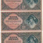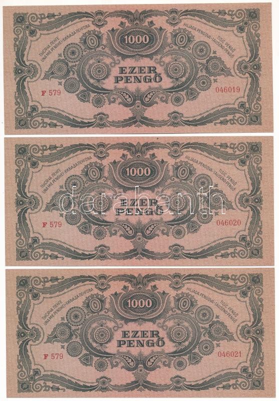 1945. 1000P (10x) sorszámkövetők „F 579 046019 – F 579 046028” T:AU / Hungary 1945. 1000 Pengő (10x) consecutive serials „F 579 046019 – F 579 046028” C:AU Adamo P22e