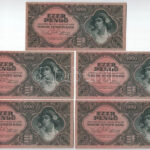 1945. 1000P (5x) sorszámkövetők ‘F 579 046014 – F 579 046018’ T:AU / Hungary 1945. 1000 Pengő (5x) consecutive serials ‘F 579 046014 – F 579 046018’ C:AU Adamo P22e<a href="https://www.darabanth.com/hu/nagyaukcio/40/kategoriak~Numizmatika/Magyar-ba