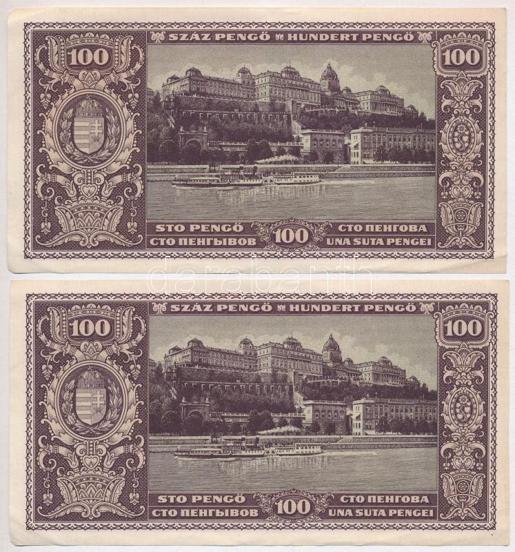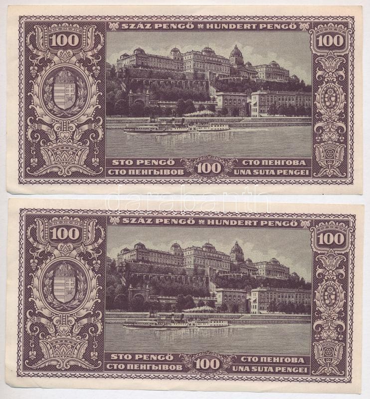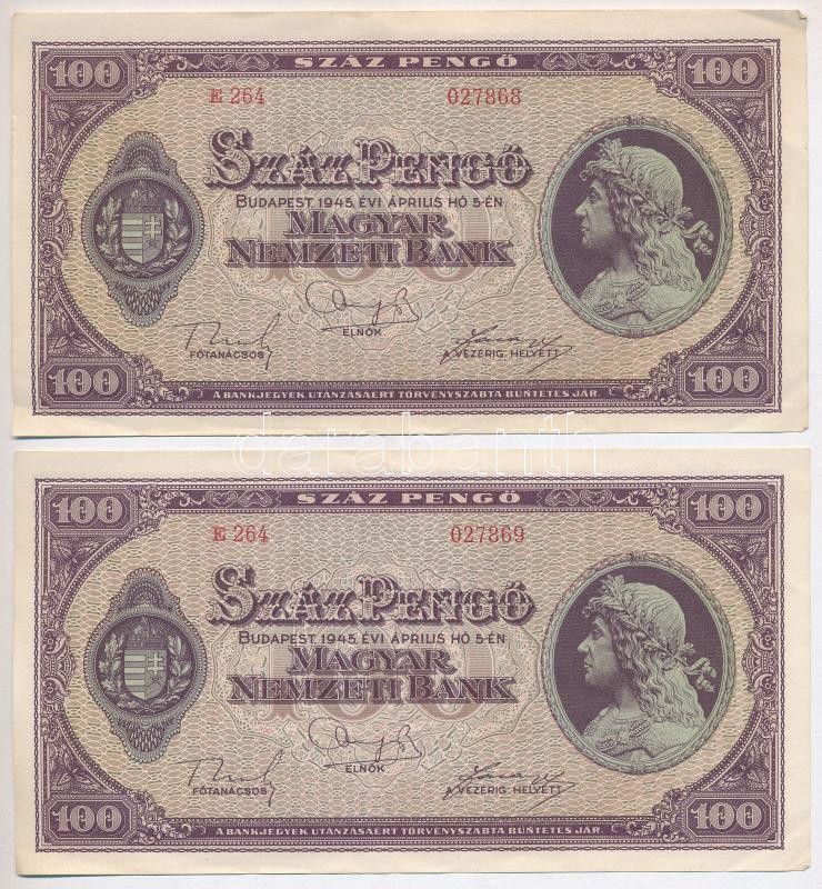 1945. 100P (4x) sorszámkövetők ‘E 264 027868-027871’ T:III az egyiken kis beszakadás, ezt leszámítva szép papír Adamo P18<a href="https://www.darabanth.com/hu/gyorsarveres/423/kategoriak~Numizmatika/Magyar-bankjegyek~6000007/1945-100P-4x-sorszamkove