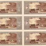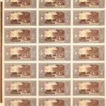 1945. 50P hátlapi fázisnyomat 21db-os ívben, ivszéllel, illesztőkerettel T:hajtatlan, feltekerve, széleken gyűrődések / Hungary 1945. 50 Pengő back progress proof in a sheet of 21, sheet edge C:unfolfed, rolled up, creases on the edges