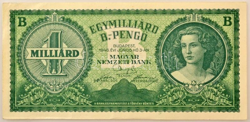 1946. 1.000.000.000BP T:XF hajtatlan, több kisebb hajlás, sarokhajlás / Hungary 1946. 1.000.000.000 Billion Pengő C:XF unfolded, more smaller bends, folded corner Adamo P40, Krause P#137