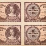 1946. 1.000.000.000P 14db-os ívben, papírráncból eredő nyomathibával, ívszéllel T:hajtatlan, feltekerve, széleken gyűrődések, fo. / Hungary 1946. 1.000.000.000 Pengő in sheet of 14, with a print error due to typografical creases, with sheet edge C:unfolde