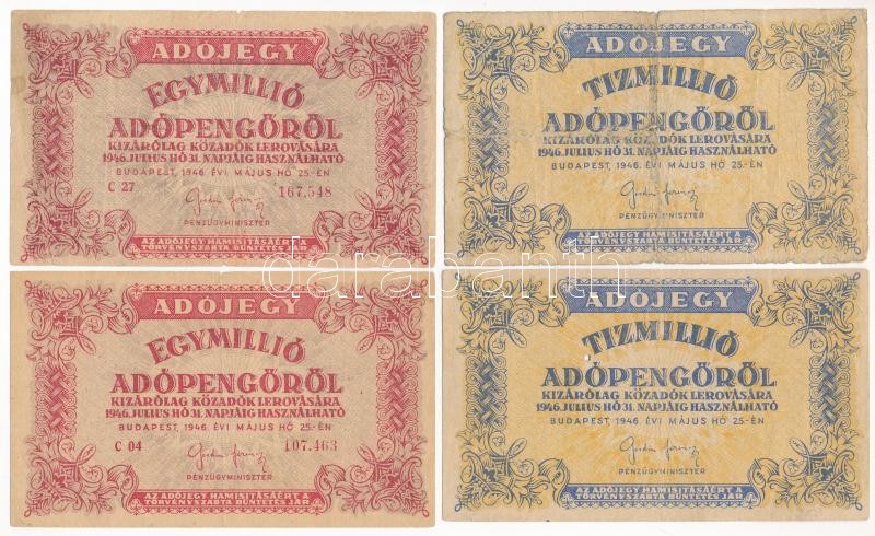 1946. 1.000.000AP sorszámos és vízjeles papír, fordított címerrel (2x) + 1946. 10.000.000AP vízjeles papír, fordított címerrel (2x) T:III-,IV Adamo P53, P54<a href="https://www.darabanth.com/hu/gyorsarveres/422/kategoriak~Numizmatika/Magyar-bankjegy