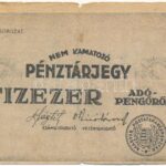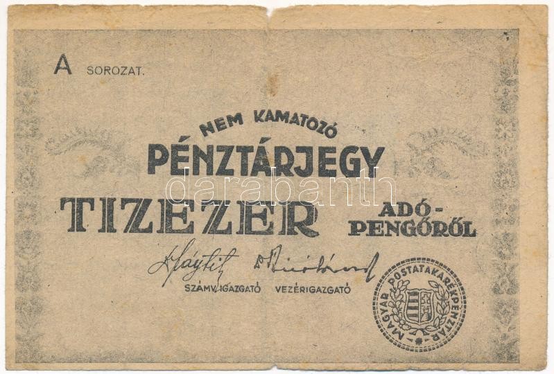 1946. 10.000AP nem kamatozó Pénztárjegy ‘Másra át nem ruházható’, bélyegzés nélkül T:III folt, a fő hajtás mentén két kis anyaghiány Adamo P57