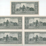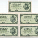 1946. 100.000.000MP (5x) T:AU / Hungary 1946. 100.000.000 Milpengő (5x) C:AU Adamo P33<a href="https://www.darabanth.com/hu/nagyaukcio/40/kategoriak~Numizmatika/Magyar-bankjegyek~16446/1946-100000000MP-5x-TAU-Hungary-1946-100000000-Milpengo-5x-CAU-