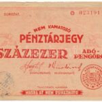 1946. 100.000AP nem kamatozó Pénztárjegy ‘Másra át nem ruházható’, ‘SZOMBATHELY’ bélyegzéssel T:III / Hungary 1946. 100.000 Adópengő non-interest savings certificate ‘Másra át nem ruházható (Non-transferable)’, with ‘SZOMBATHELY’ cancellation C:F Adamo P5