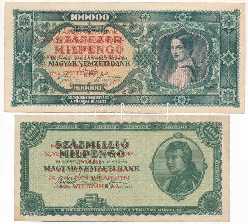 1946. 100.000MP + 1946. 100.000.000MP mind ‘Magyar Éremgyűjtők Egyesületének IV. Vándorgyűlése az 1000 éves Esztergomban és a 100 éves Budapesten 1973. szeptember 8-9.’ felülbélyegzéssel T:III. Adamo FO9.1.16, FO9.1.17<a href="https://www.darabanth.