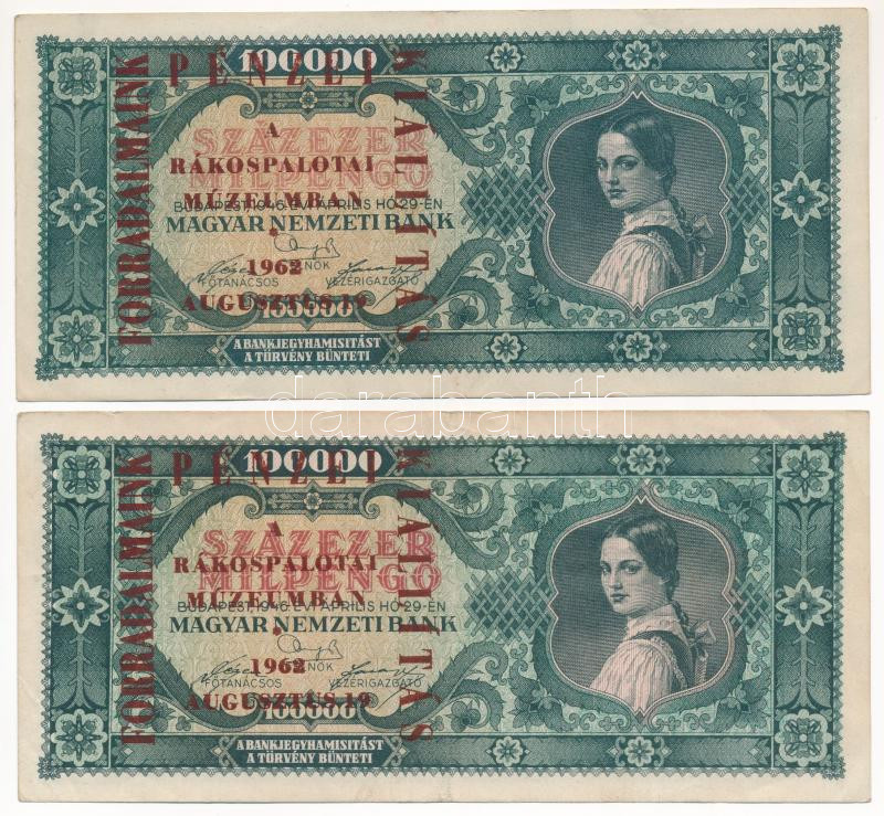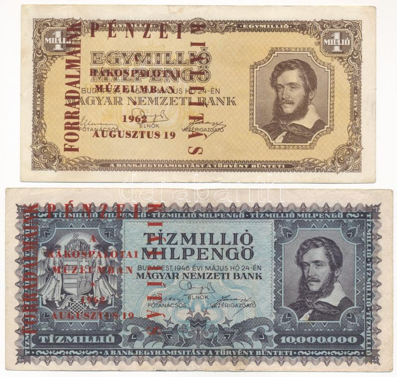 1946. 100.000MP (2x) + 1946. 1.000.000MP + 1946. 10.000.000MP mind ‘Forradalmaink Pénzei Kiállítás Kecskemét, 1969. március 23-30’ felülbélyegzéssel T:III Adamo FF12.1.21, FF12.1.24, FO12.1.13<a href="https://www.darabanth.com/hu/gyorsarveres/435/ka