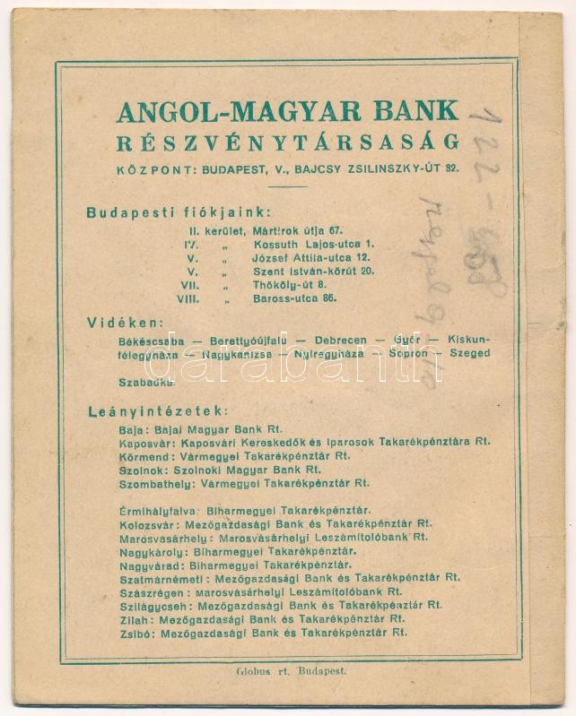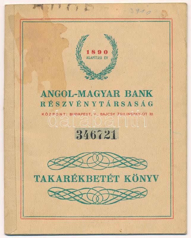 1946. ‘Angol-Magyar Bank Részvénytársaság’ takarékbetét könyve, bejegyzéssel<a href="https://www.darabanth.com/hu/gyorsarveres/423/kategoriak~Numizmatika/Numizmatikaval-kapcsolatos-egyeb-tetelek~6000003/1946-Angol-Magyar-Bank-Reszvenytarsasag-takare