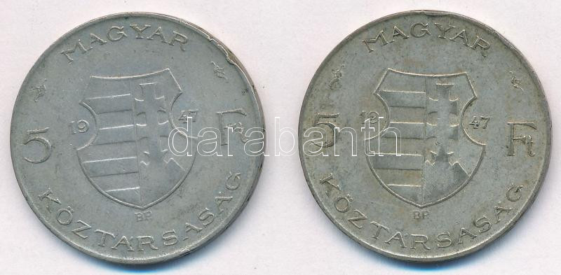 1947. 5Ft Ag ‘Kossuth’ (2x) T:VF,F patina Adamo F8.1<a href="https://www.darabanth.com/hu/gyorsarveres/440/kategoriak~Numizmatika/Magyar-es-magyar-verdejelu-fem-es-ezustpenzek~1500008/1947-5Ft-Ag-Kossuth-2x-TVF-F-patina-Adamo-F81~II2869012/?utm_sour