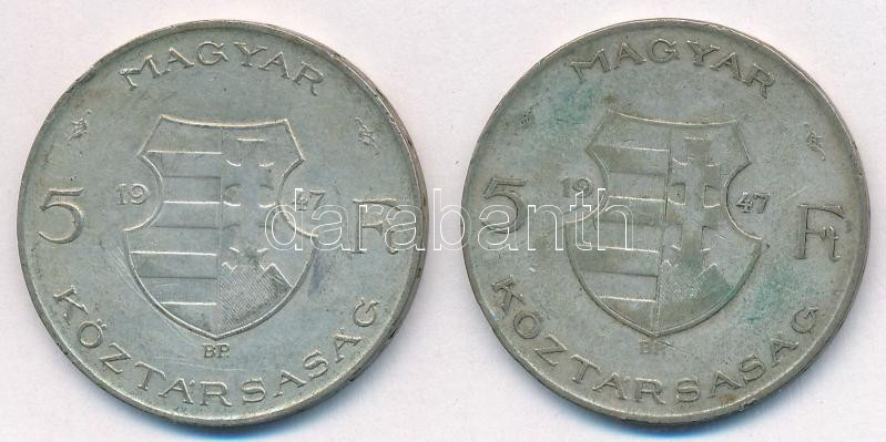 1947. 5Ft Ag ‘Kossuth’ (2x) T:VF,F patina Adamo F8.1<a href="https://www.darabanth.com/hu/gyorsarveres/438/kategoriak~Numizmatika/Magyar-es-magyar-verdejelu-fem-es-ezustpenzek~1500008/1947-5Ft-Ag-Kossuth-2x-TVF-F-patina-Adamo-F81~II2869015/?utm_sour