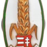 ~1947. ‘Aranykalászos Gazda’ Tildy-címeres zománcozott bronz jelvény, csavaros hátlap, ‘CEGLÉD 25’ gravírozással (46x24mm) T:1-,2 ph. / Hungary ~1947. ‘Aranykalászos Gazda’ enamelled screwback bronze badge with Tildy coat of arms, engraved on backside ‘CE
