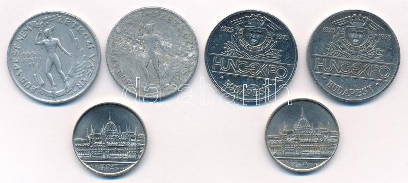 1948. június 11. ‘Magyar Állami Pénzverő – Budapesti Nemzetközi Vásár’ (2x) kétoldalas Al emlékérem (32mm) + 1975. ‘Hungexpo / Budapesti Tavaszi Nemzetközi Vásár’ (2x) kétoldalas fém emlékérem (32mm) + 1994. ‘Első választó’ (2x) kétoldalas fém emlékérem (