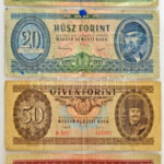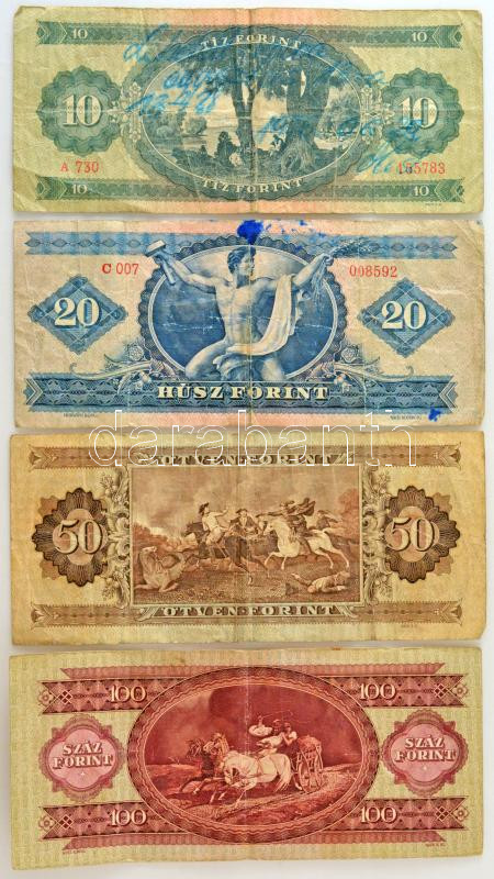 1949. 10Ft + 20Ft + 100Ft + 1951. 50Ft T:F,VG közte folt, firka<a href="https://www.darabanth.com/hu/gyorsarveres/439/kategoriak~Numizmatika/Magyar-bankjegyek~500007/1949-10Ft-plus-20Ft-plus-100Ft-plus-1951-50Ft-TF-VG-kozte-folt-firka~II2875214/?utm