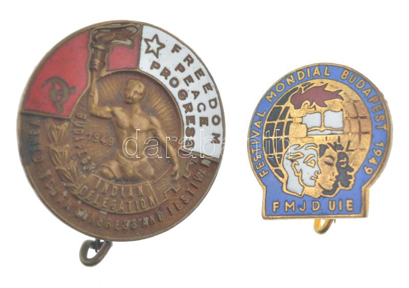 1949. ‘Világ Ifjúsági Kongresszus és Fesztivál – indiai delegáció’ zománcos Cu kitűző angol felirattal (28mm) + ‘Világ Ifjúsági Kongresszus és Fesztivál – Budapest 1949’ zománcos tombak kitűző román nyelvű felirattal (20x20mm) T:1- folt 1949. ‘World Youth
