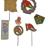 ~1955-1975. ‘II Országos Úttörő Találkozó’ eloxált Al jelvény (40x28mm) + ‘aranykoszorús’ festett sárgaréz kitüntető jelvény (21mm) + ‘Kiváló úttörő munkáért’ műgyantás, rátétes Cu jelvény (34x32mm) + 2xklf ‘Előre’ festett és zománcos jelvény + ‘MÉH’ hull