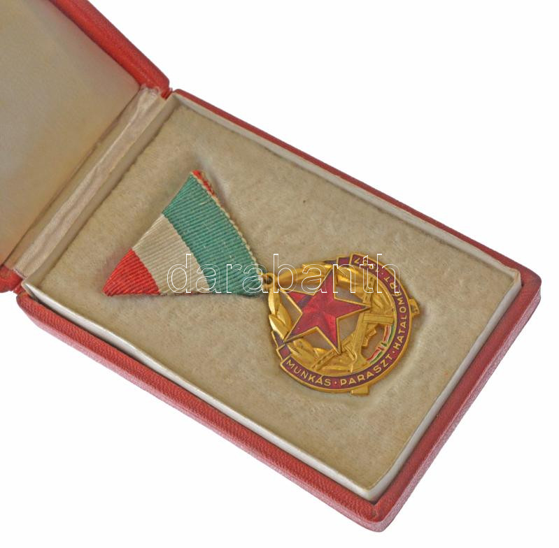 1957. ‘Munkás-Paraszt Hatalomért Emlékérem’ aranyozott, zománcozott bronz kitüntetés mellszalagon, eredeti tokban T:2 zománchiba NMK 700.<a href="https://www.darabanth.com/hu/gyorsarveres/430/kategoriak~Numizmatika/Falerisztika-Kituntetesek-jelvenye